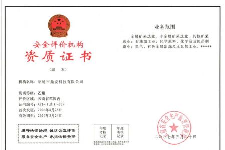 2003年11月10日,昭通市鼎安科技有限公司成立,初始主要從事第三方安全工程技術(shù)服務(wù),經(jīng)多年運(yùn)營(yíng),發(fā)展為多專業(yè)綜合科技平臺(tái),為社會(huì)提供多種專業(yè)技術(shù)服務(wù)工作。 現(xiàn)公司注冊(cè)資金為1200萬(wàn)元,公司法定代表人:毛衛(wèi)旭。公司主要業(yè)務(wù):安全評(píng)價(jià)、安全標(biāo)準(zhǔn)化評(píng)審、安全工程技術(shù)服務(wù);環(huán)境監(jiān)測(cè)、職業(yè)衛(wèi)生檢測(cè)、檢驗(yàn);法律訴訟及非訴訟服務(wù);司法鑒定、固定資產(chǎn)投資項(xiàng)目節(jié)能服務(wù);工程咨詢;工程測(cè)量測(cè)繪;安全教育培訓(xùn)等。是安全生產(chǎn)服務(wù)、安全教育培訓(xùn)機(jī)構(gòu),也是環(huán)境監(jiān)測(cè)和職業(yè)衛(wèi)生服務(wù)機(jī)構(gòu),同時(shí)也是綜合的檢測(cè)檢驗(yàn)、綜合科技平臺(tái)服務(wù)機(jī)構(gòu)。多年來為公、檢、法、司、軍、警、海關(guān)、仲裁、安監(jiān)、工礦商貿(mào)企業(yè)、社會(huì)團(tuán)體及個(gè)人提供多專業(yè)技術(shù)服務(wù)。